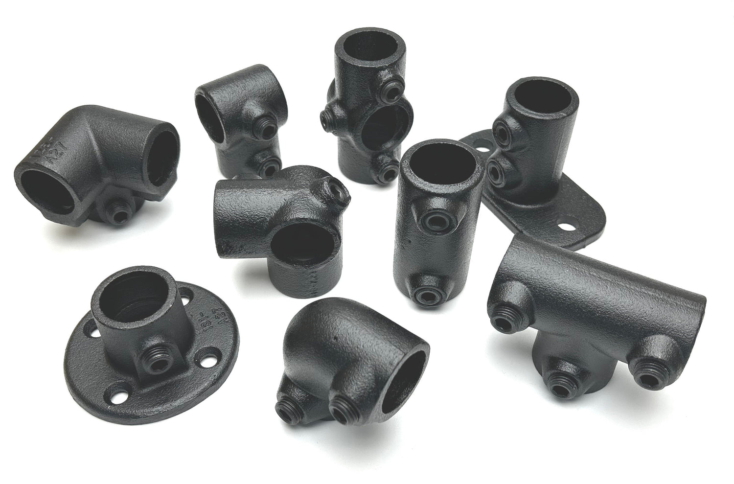Fittings i sort galvaniseret støbejern. Disse fittings passer til alle vores rundrør...